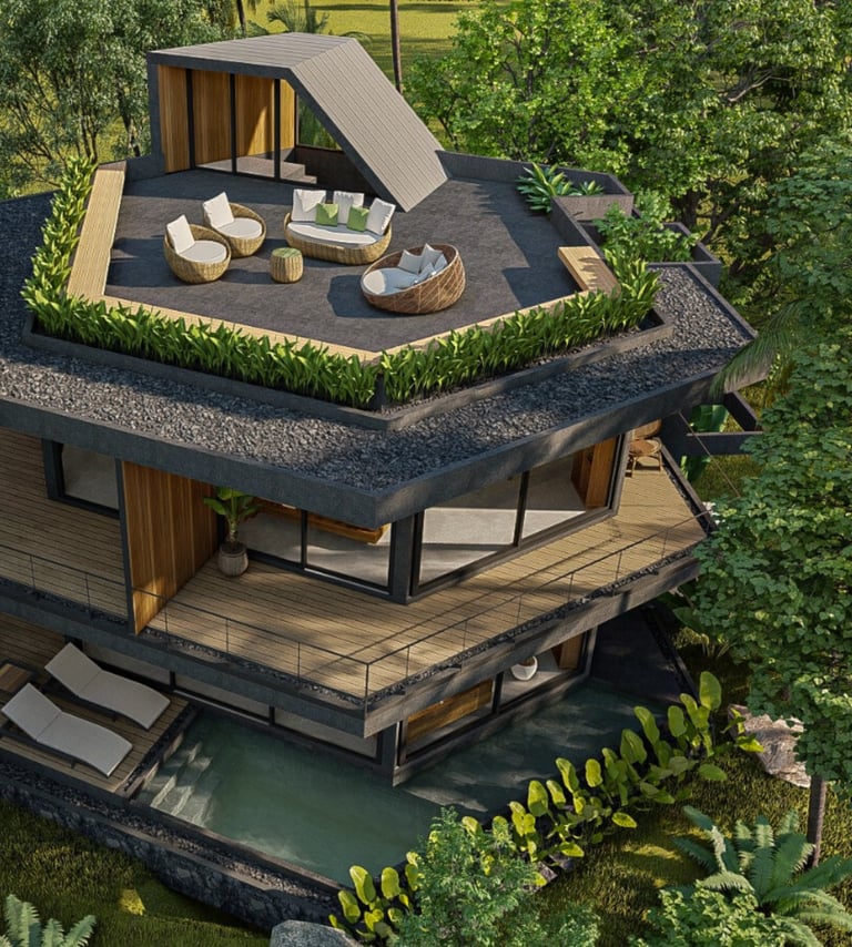 Casa Tásana integrates architecture with its natural surroundings, preserving trees and ancient boulders, using natural materials, and incorporating roof gardens and passive cooling strategies. Open layouts and terraces blur the line between inside and out — so air, light, and greenery become part of everyday life.